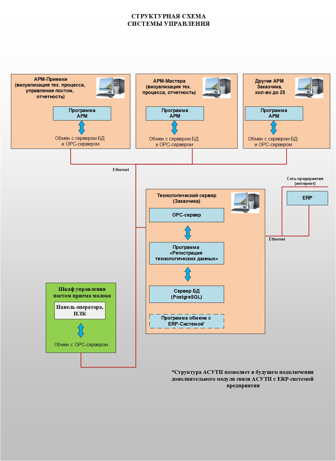Созданная ООО «АСУ-Техно» Система построена на базе клиент-серверной технологии и состоит из OPC-сервера, который опрашивает все данные с контроллеров, архиватора и программы АРМ. Количество компьютеров, находящихся в заводской сети, на которых можно открыть программу АРМ неограниченно.