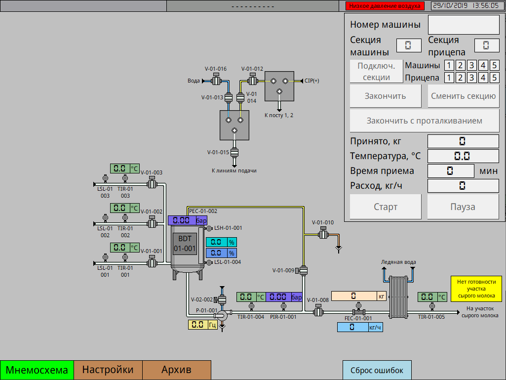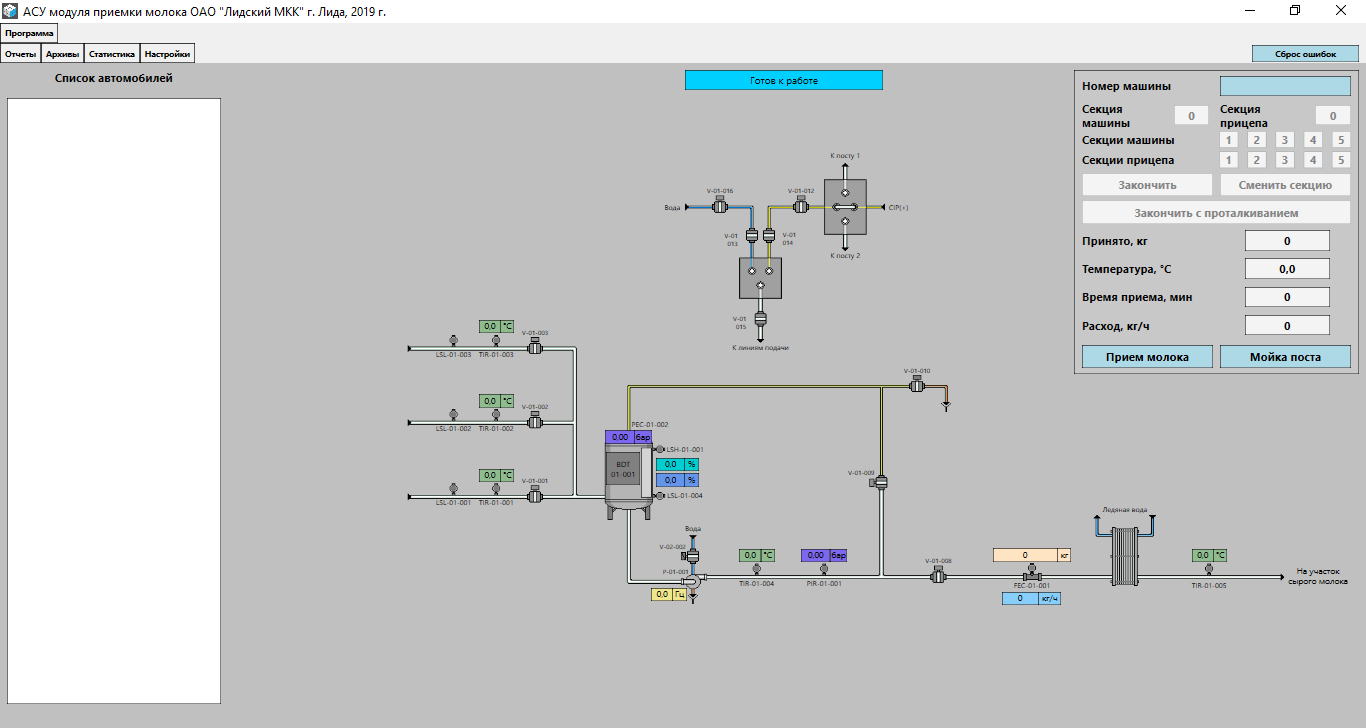 Во всех трех случаях пост работает в автоматическом режиме. В программном обеспечении учтены большинство нюансов работы участка приемки молока. Такие как: (в одной секции может быть молоко от нескольких поставщиков/накладных, на одну машину имеется несколько накладных и др.)
